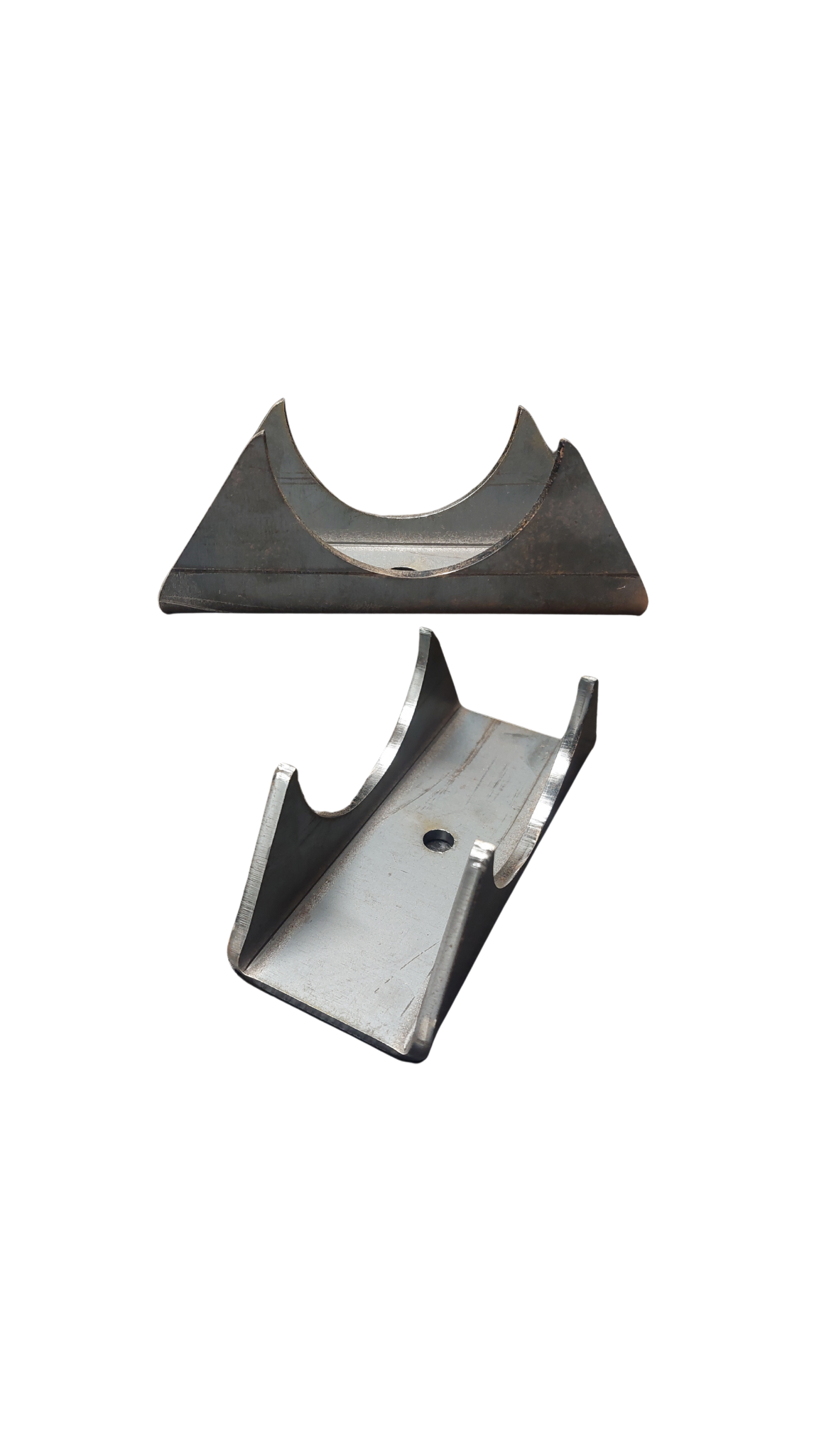 The saddles are laser cut and CNC folded ex. 5mm mild steel. The saddles are 60mm wide x 140mm long x 15mm high and they are notched for 3" tube.