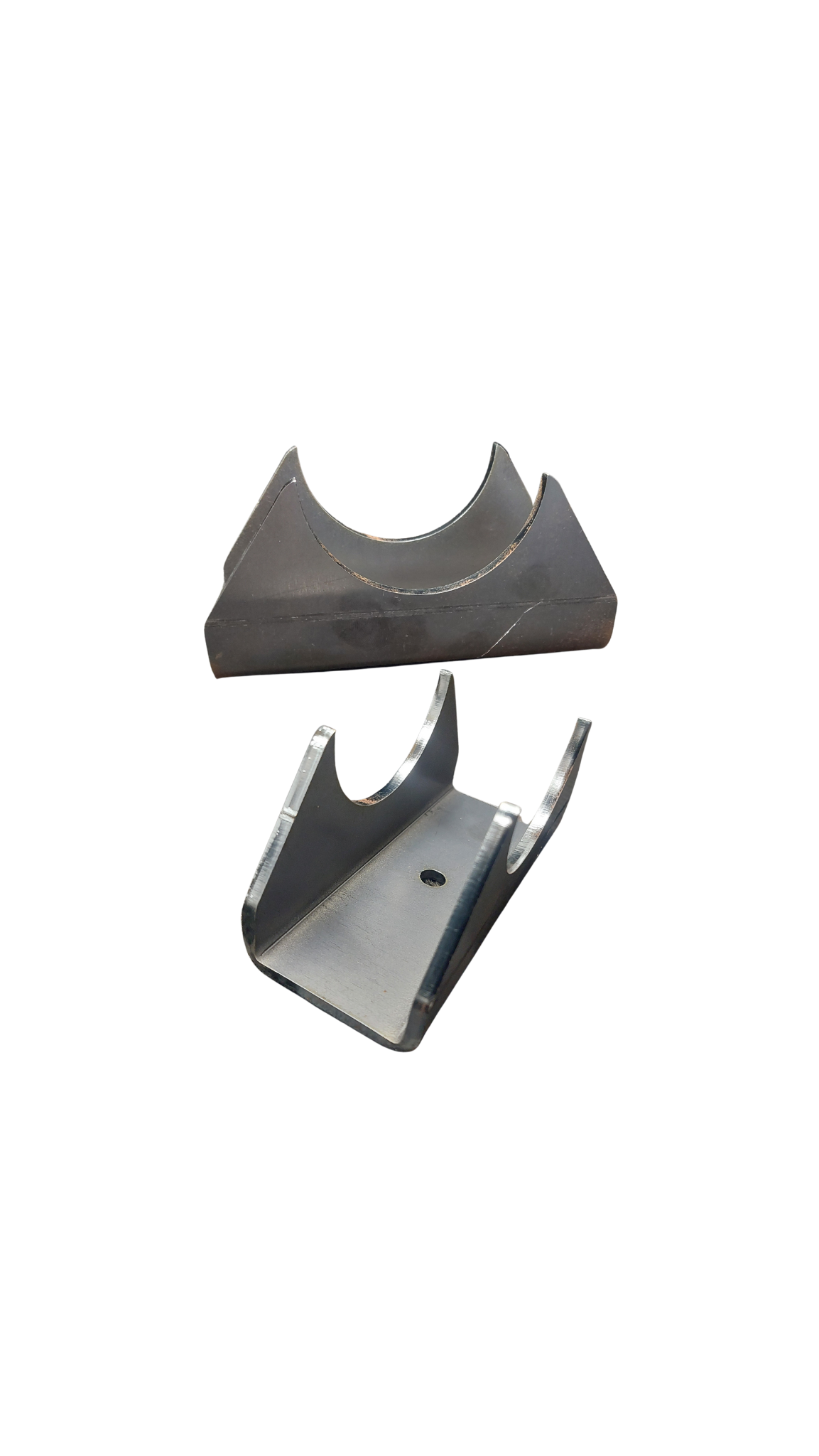 The saddles are laser cut and CNC folded ex. 5mm mild steel. The saddles are 60mm wide x 140mm long x 30mm high and they are notched for 3" tube.